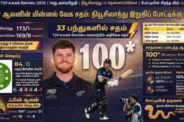 T20 உலகக் கிண்ணத்தில் புதிய சாதனை: 33 பந்துகளில் சதம் விளாசி கெய்லின் சாதனையை முறியடித்தார் ஃபின் ஆலன்!