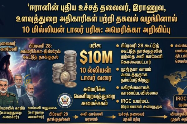 ஈரானின் புதிய உச்சத் தலைவர் உள்ளிட்ட இராணுவ, உளவுத்துறை அதிகாரிகள் பற்றி தகவல் வழங்கினால் 10 மில்லியன் டாலர் பரிசு: அமெரிக்கா அறிவிப்பு