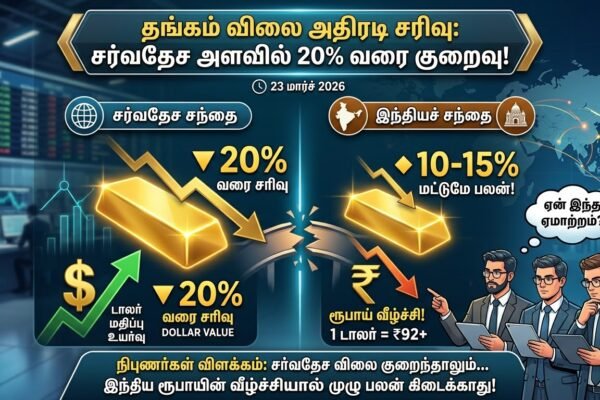 தலைப்பு: அதிரடியாகச் சரிந்த தங்கம் விலை! 20% குறைந்தாலும் இந்தியர்களுக்கு ஏமாற்றமே! நிபுணர்கள் சொல்லும் ‘ஷாக்’ விளக்கம்!