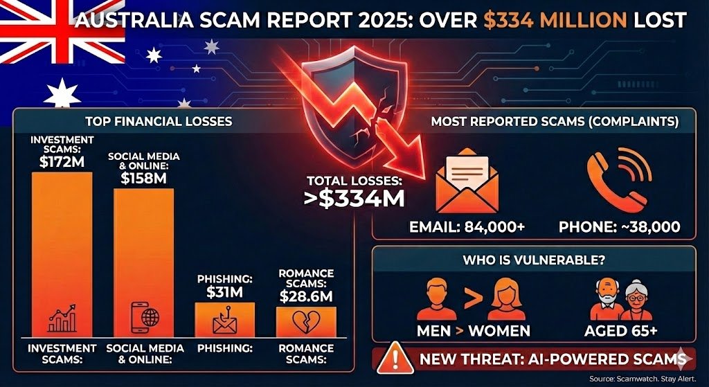 (கன்பெரா) – 2025 ஆம் ஆண்டில் ஆஸ்திரேலியர்கள் பல்வேறு வகையான மோசடிகளால் 334 மில்லியன் டாலர்களுக்கும் அதிகமான பணத்தை இழந்துள்ளதாகப் புதிய அறிக்கை ஒன்று அதிர்ச்சித் தகவலை வெளியிட்டுள்ளது. 2024 ஆம் ஆண்டுடன் ஒப்பிடுகையில், கடந்த ஆண்டில் இந்த இழப்புத் தொகை அதிகரித்துள்ளதாகச் சுட்டிக்காட்டப்பட்டுள்ளது.
