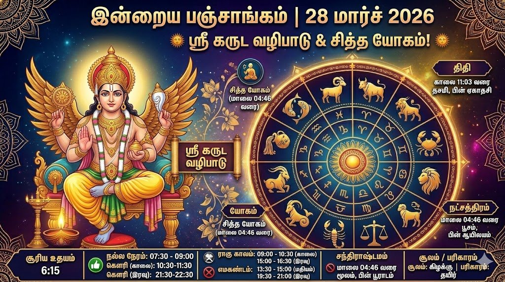 இன்றைய பஞ்சாங்கம்: 28 மார்ச் 2026 (சனிக்கிழமை) – கருட வழிபாடு சிறப்பு
