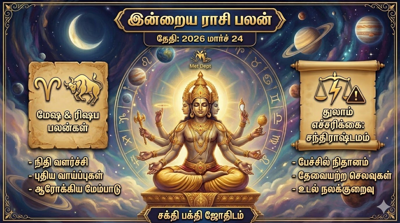 இன்றைய பஞ்சாங்கத் தகவல்கள்: இன்று மார்ச் 24, 2026 (திங்கட்கிழமை), பங்குனி மாதம் 10-ஆம் தேதி. சந்திர பகவான் இன்று ரிஷப ராசியில் ரோகிணி மற்றும் மிருகசீரிஷம் நட்சத்திரங்களில் சஞ்சரிக்கிறார். இன்று சஷ்டி விரத தினம் மற்றும் சித்த யோகம் நிறைந்த மங்களகரமான நாள்.