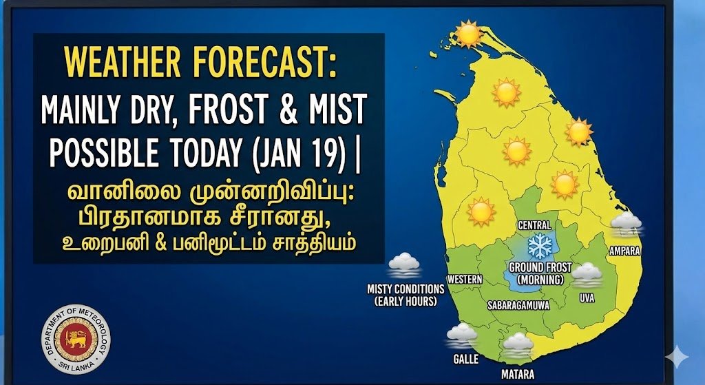 கொழும்பு, ஜனவரி 19: நாட்டின் பெரும்பாலான பகுதிகளில் இன்று (19) பிரதானமாகச் சீரான (வறண்ட) வானிலை நிலவும் என வளிமண்டலவியல் திணைக்களம் தெரிவித்துள்ளது.