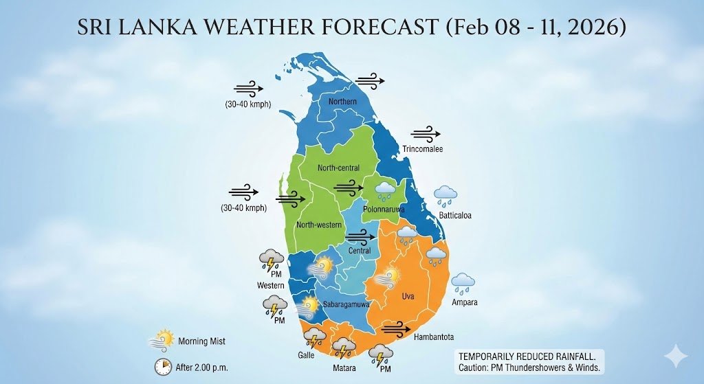 கொழும்பு, பிப்ரவரி 08, 2026: நாடளாவிய ரீதியில் தற்போது நிலவும் மழையுடனான வானிலை நிலைமை இன்று (08) முதல் எதிர்வரும் பெப்ரவரி 11 ஆம் திகதி வரை தற்காலிகமாகக் குறைவடையும் என வளிமண்டலவியல் திணைக்களம் எதிர்வுகூறியுள்ளது.