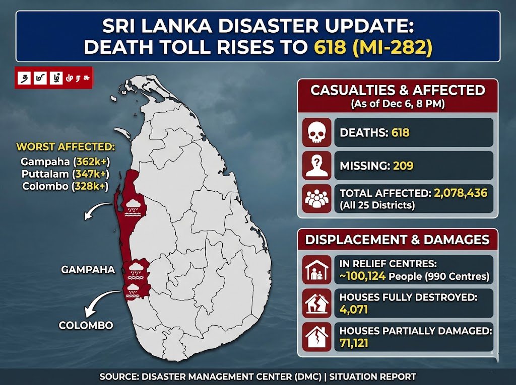 கொழும்பு, டிசம்பர் 07: நாட்டில் நிலவிய சீரற்ற வானிலை காரணமாக ஏற்பட்ட அனர்த்தங்களினால் உயிரிழந்தவர்களின் எண்ணிக்கை நேற்று (06) இரவு 8.00 மணி நிலவரப்படி 618 ஆக அதிகரித்துள்ளதாக அனர்த்த முகாமைத்துவ நிலையம் (DMC) தெரிவித்துள்ளது.