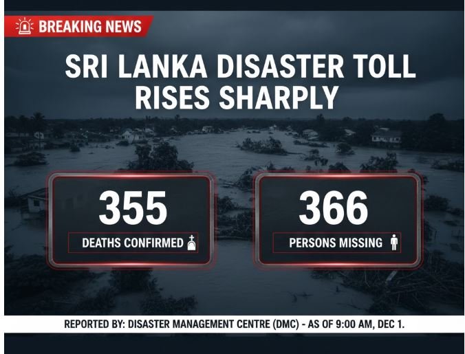கொழும்பு, டிசம்பர் 01: நாட்டில் நிலவும் மோசமான வானிலை காரணமாக ஏற்பட்ட அனர்த்தங்களைத் தொடர்ந்து, இன்று காலை 9:00 மணி நிலவரப்படி, மொத்தம் 355 பேர் உயிரிழந்துள்ளது உறுதிப்படுத்தப்பட்டுள்ளதுடன், 366 பேர் தொடர்ந்து காணாமல் போயுள்ளதாகவும் அனர்த்த முகாமைத்துவ நிலையம் (DMC) தெரிவித்துள்ளது.