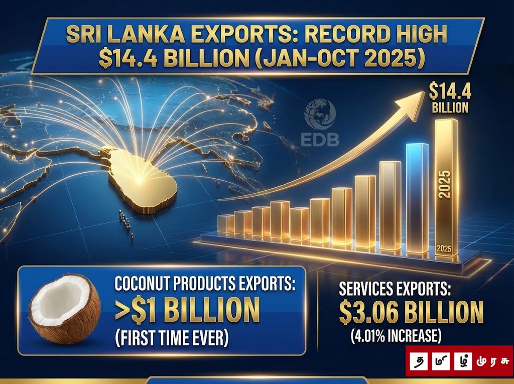 ஜனவரி-அக்டோபர் காலப்பகுதியில் நாட்டின் ஏற்றுமதி வருமானம் 14 பில்லியன் அமெரிக்க டாலர் என்ற மைல்கல்லைத் தாண்டுவது இதுவே முதல் முறை என்று ஏற்றுமதி அபிவிருத்தி சபை (EDB) தெரிவித்துள்ளது.