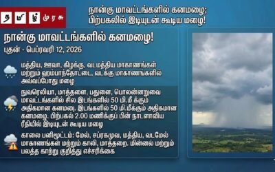- வடக்கில் கனமழை: வடக்கு மாகாணத்தில் சில இடங்களில் 50 மில்லிமீற்றர் வரையிலான ஓரளவு பலத்த மழை பெய்ய வாய்ப்புள்ளது.