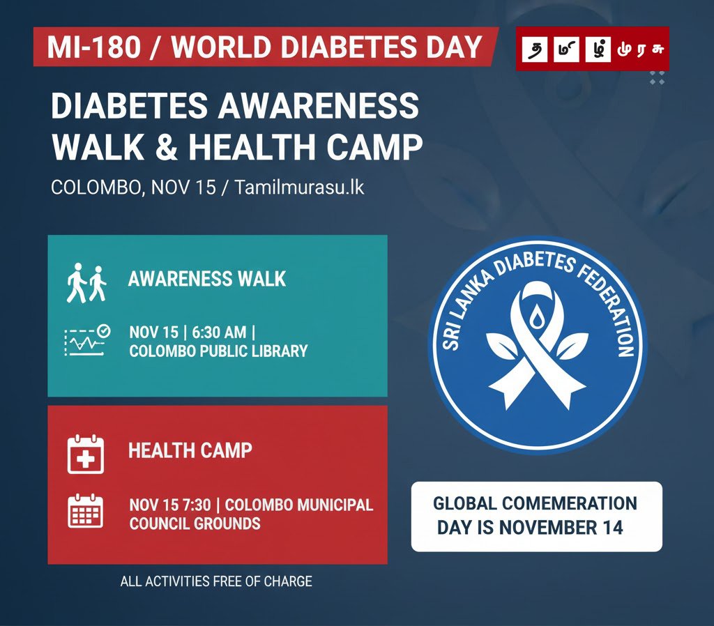 நாளைய தினம் காலை 6.30 மணிக்கு கொழும்பு பொது நூலக வளாகத்தில் இருந்து நீரிழிவு குறித்த விழிப்புணர்வு நடைபயணம் (awareness walk) ஆரம்பிக்க திட்டமிடப்பட்டுள்ளது.