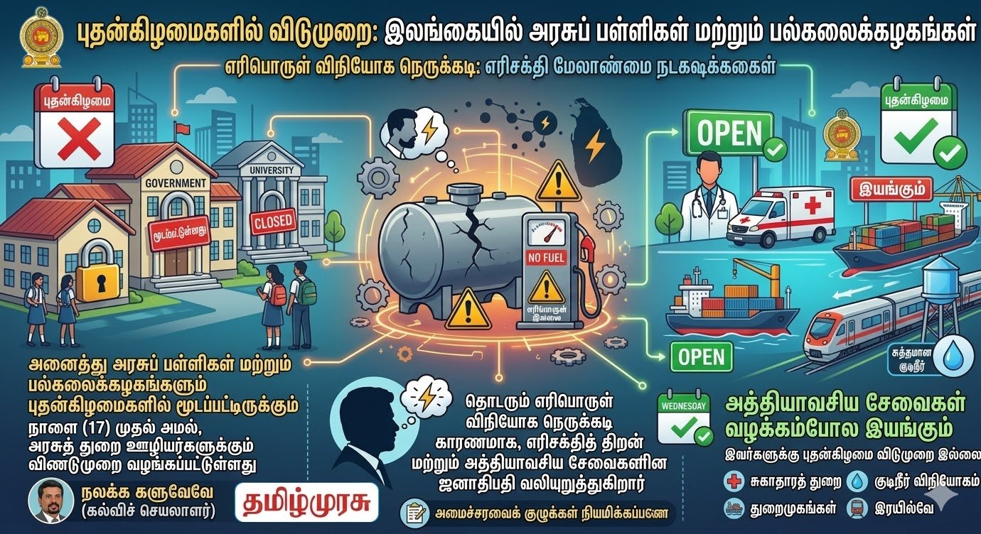 இதேவேளை, எரிபொருள் நெருக்கடியைக் கருத்திற்கொண்டு, நாளை (17) முதல் மறு அறிவித்தல் வரை ஒவ்வொரு புதன்கிழமையும் அனைத்து அரசு ஊழியர்களுக்கும் விடுமுறை வழங்கப்படும் என அத்தியாவசிய சேவைகள் ஆணையாளர் நாயகம் பிரபாத் சந்திரகீர்த்தி தெரிவித்தார். இந்தப் புதன்கிழமை விடுமுறை, பள்ளிகள், பல்கலைக்கழகங்கள் மற்றும் நீதித்துறைக்கும் பொருந்தும் என்றும் அவர் மேலும் கூறினார்.