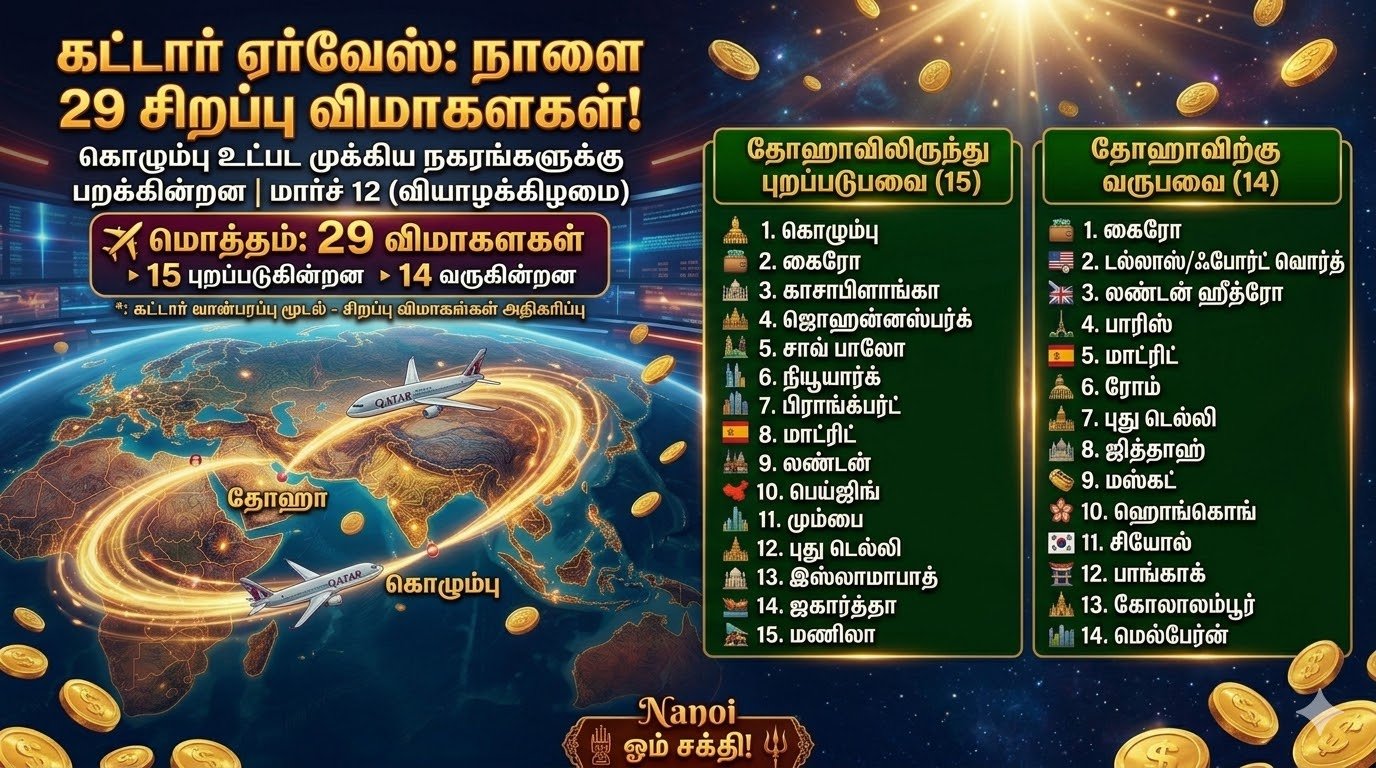 இதன்படி, நாளை வியாழக்கிழமை (மார்ச் 12) கட்டார் ஏர்வேஸ் 29 விமானங்களை இயக்கவுள்ளதாக அறிவித்துள்ளது. இவற்றில் 15 விமானங்கள் தோஹாவிலிருந்து புறப்படவுள்ளதுடன், 14 விமானங்கள் தோஹாவை வந்தடையவுள்ளன.