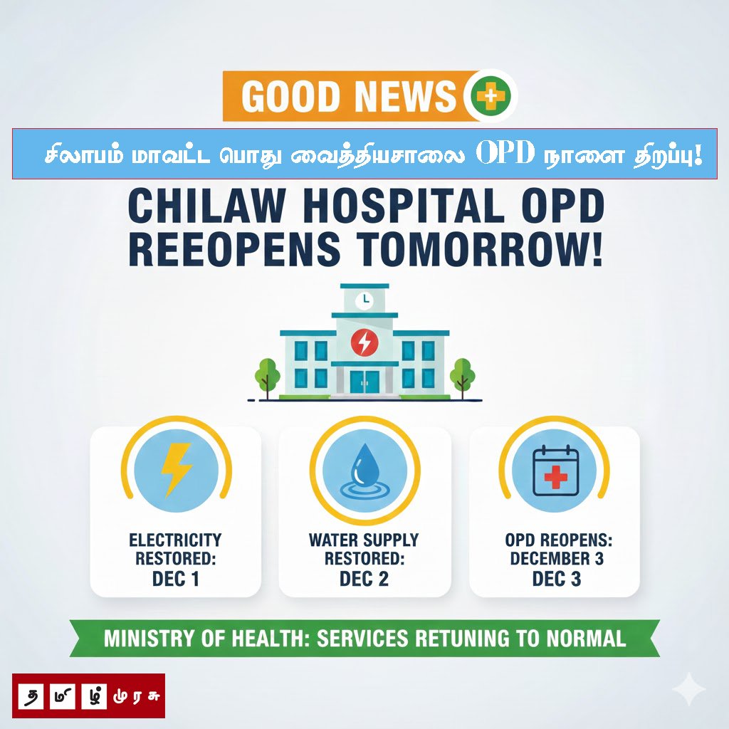 கொழும்பு, டிசம்பர் 02: நாட்டில் ஏற்பட்ட அனர்த்த நிலை காரணமாகத் தற்காலிகமாக நிறுத்தப்பட்டிருந்த சிலாபம் மாவட்டப் பொது வைத்தியசாலையின் வெளிநோயாளர் பிரிவு (OPD) நாளை (03) முதல் மீண்டும் திறக்க நடவடிக்கை எடுக்கப்பட்டுள்ளதாகச் சுகாதார அமைச்சு தெரிவித்துள்ளது.