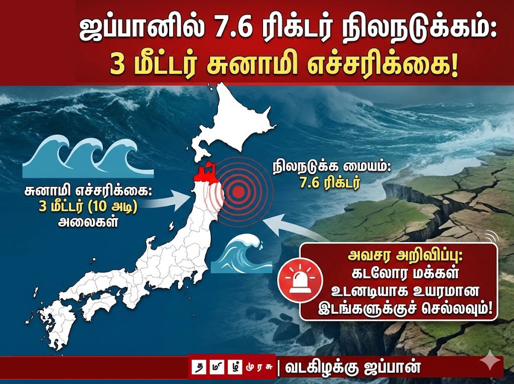 சுனாமி எச்சரிக்கை: ஜப்பான் வானிலை ஆய்வு மையத்தின் (JMA) தகவலின்படி, ஜப்பானின் வடகிழக்குக் கடற்கரையைத் தாக்கும் அலைகள் மூன்று மீட்டர் (சுமார் 10 அடி) உயரம் வரை எழக்கூடும் என்று எச்சரிக்கப்பட்டுள்ளது. இதனால், கடலோரப் பகுதிகளில் வசிக்கும் மக்கள் உடனடியாகப் பாதுகாப்பான உயரமான இடங்களுக்குச் செல்லுமாறு அறிவுறுத்தப்பட்டுள்ளனர்.
