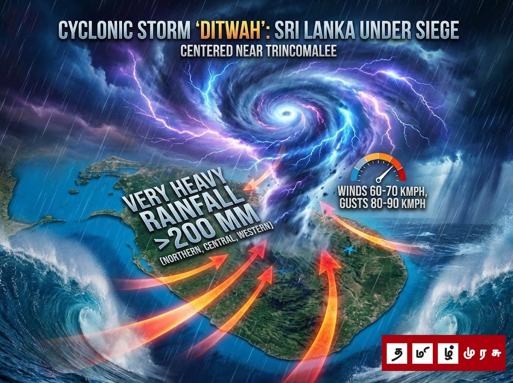 டிட்வா” புயல் திருகோணமலைக்கு தெற்கே மையம் கொண்டுள்ளது: 200 மி.மீ. வரை மிக பலத்த மழை, 80-90 கி.மீ. வேகத்தில் காற்று! – வளிமண்டலவியல் திணைக்களம் எச்சரிக்கை!