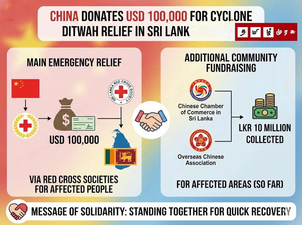 கொழும்பு, டிசம்பர் 01: ‘டிட்வா’ புயல் காரணமாகக் கடுமையாகப் பாதிக்கப்பட்டுள்ள இலங்கை மக்களுக்காகச் சீனா ஒரு இலட்சம் அமெரிக்க டொலர்களை (USD 100,000) வழங்கியுள்ளது.