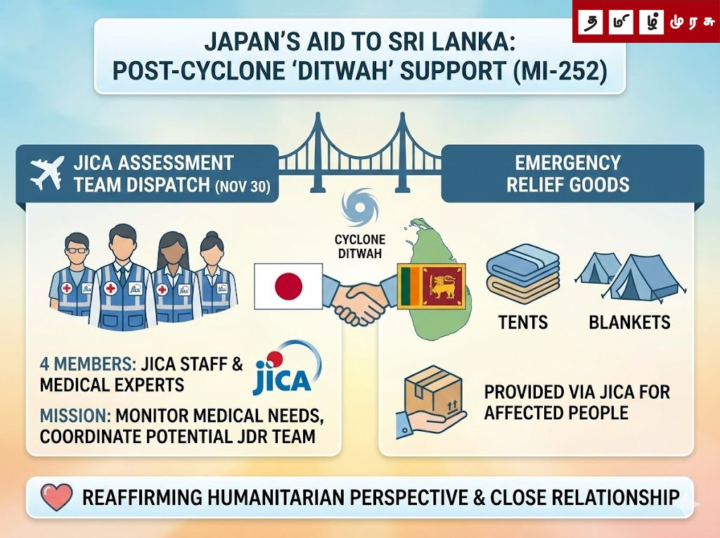மனிதாபிமானக் கண்ணோட்டம் மற்றும் இலங்கை மக்களுடனான நெருங்கிய உறவை மீண்டும் உறுதிப்படுத்தும் வகையில், ‘டிட்வா’ புயலால் பாதிக்கப்பட்டவர்களுக்கு அவசர உதவிகளை வழங்க ஜப்பான் அரசாங்கம் தீர்மானித்துள்ளதாக அந்த அறிக்கையில் தெரிவிக்கப்பட்டுள்ளது.
