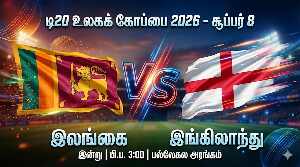 கண்டி, பிப். 22: 2026 டி20 உலகக் கோப்பை கிரிக்கெட் தொடரின் சூப்பர் 8 சுற்றில், இலங்கை மற்றும் இங்கிலாந்து அணிகளுக்கு இடையேயான மிக முக்கியமான போட்டி இன்று (22) ஞாயிற்றுக்கிழமை நடைபெறவுள்ளது.