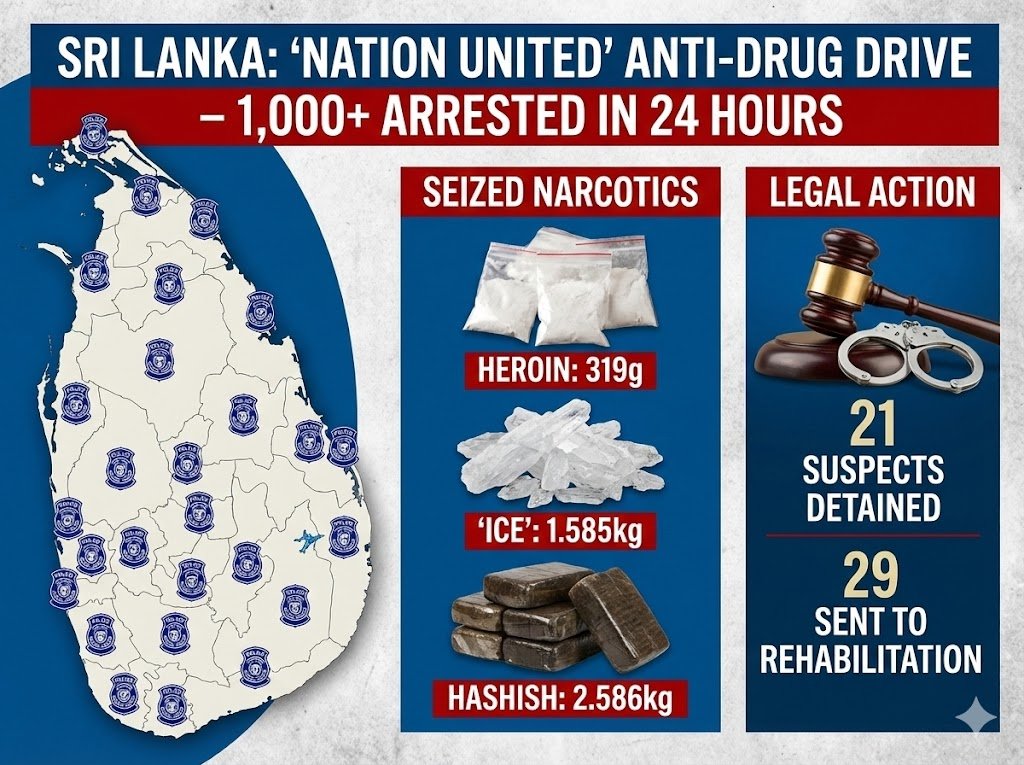 நாடு தழுவிய போதைப்பொருள் ஒழிப்பு வேட்டை: ஒரே நாளில் 1,000க்கும் மேற்பட்டோர் கைது! – பொலிஸ் அதிரடி!