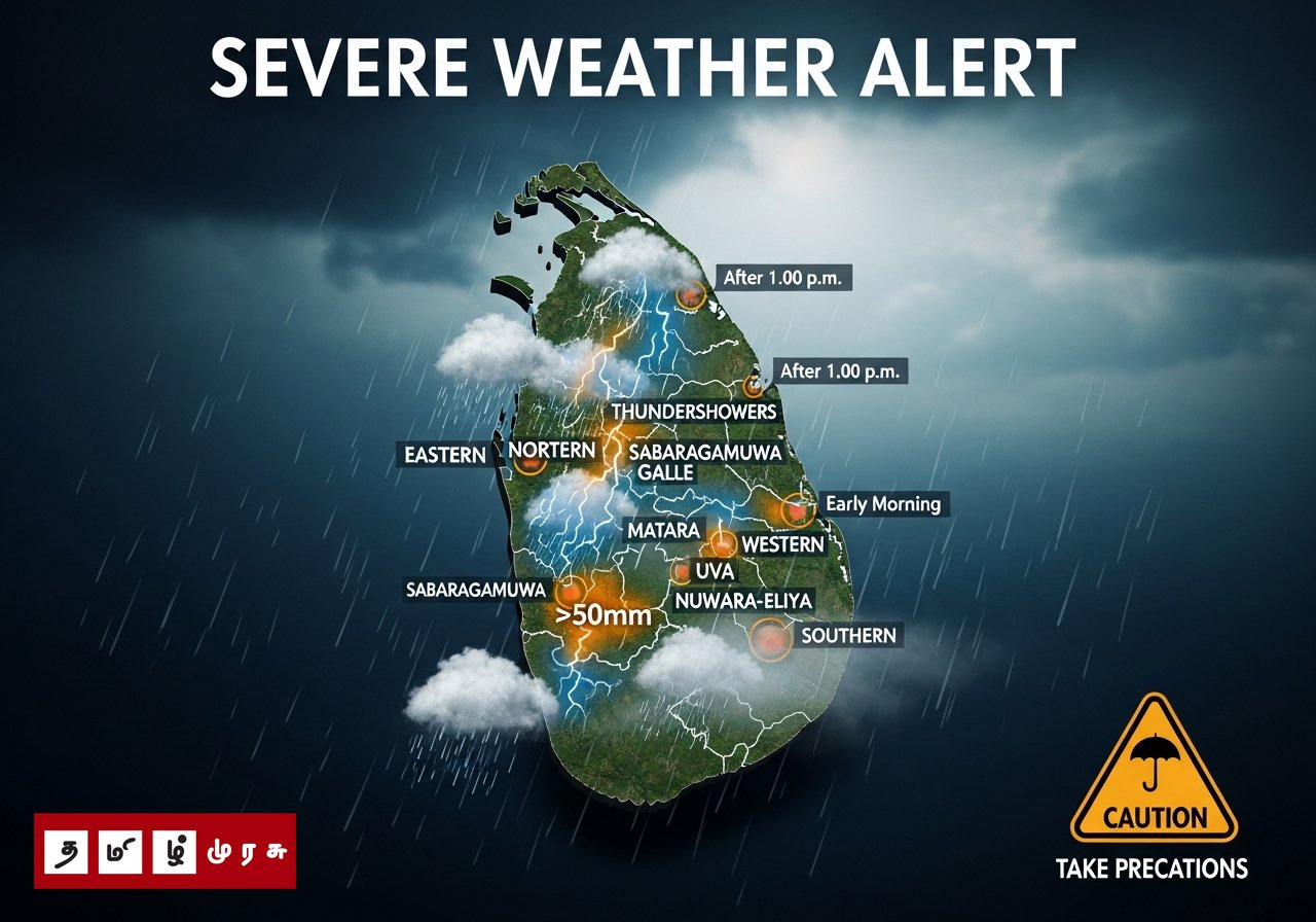 மேற்கு மற்றும் சப்ரகமுவ மாகாணங்களிலும் அத்துடன் காலி, மாத்தறை மற்றும் நுவரெலியா மாவட்டங்களிலும் சில இடங்களில் 50 மி.மீ. இற்கும் அதிகமான ஓரளவு பலத்த மழை பெய்ய வாய்ப்புள்ளது.