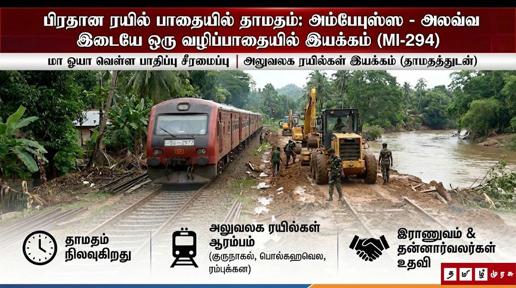 பின்னணி: அண்மையில் நிலவிய சீரற்ற வானிலை காரணமாக மா ஓயா பெருக்கெடுத்ததில், அம்பேபுஸ்ஸ – அலவ்வ இடையே உள்ள புஜ்ஜொமுவ ரயில் நிலையத்திற்கு அருகிலுள்ள மதகு (culvert) ஒன்று சேதமடைந்தது. இதன் காரணமாக ரயில் தண்டவாளத்திற்கு அடியில் சுமார் 45 அடி ஆழமான பள்ளம் (cavity) ஏற்பட்டதாக ரயில்வே திணைக்களம் குறிப்பிட்டது.