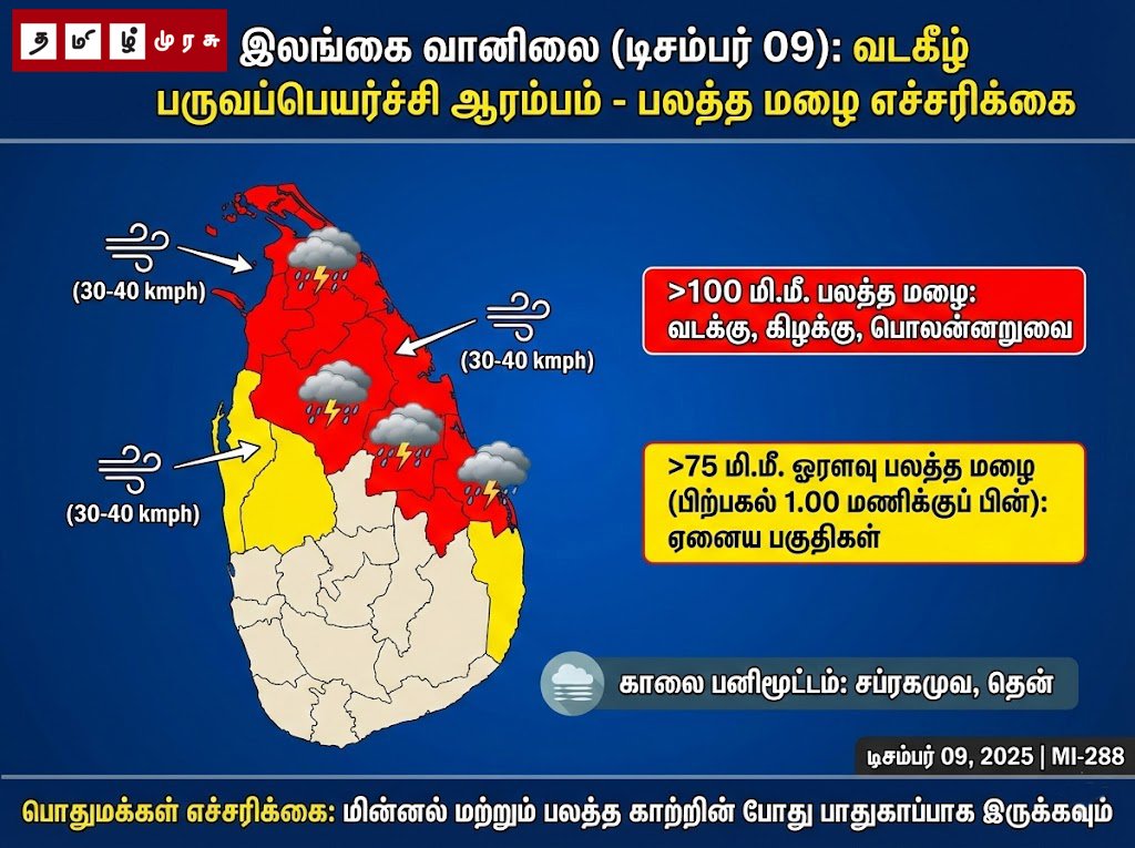 இதன் காரணமாக, இன்று (09) வடக்கு, கிழக்கு மாகாணங்களிலும் பொலன்னறுவை மாவட்டத்திலும் சில இடங்களில் 100 மில்லிமீற்றருக்கும் அதிகமான பலத்த மழை பெய்யக்கூடும் என எதிர்வு கூறப்பட்டுள்ளது.