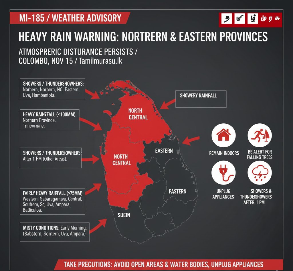 இதன் காரணமாக, வடக்கு, வடமத்திய மற்றும் கிழக்கு மாகாணங்களில் அவ்வப்போது மழை அல்லது இடியுடன் கூடிய மழை பெய்யும்.