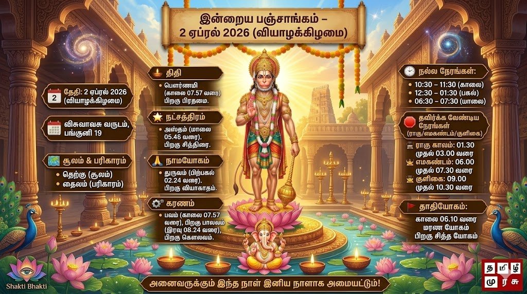 இன்றைய முக்கியமான பஞ்சாங்க விவரங்கள்: 🗓️ நாள்: 02.04.2026 (வியாழக்கிழமை) 🪔 திதி: இன்று காலை 07.57 வரை பௌர்ணமி. பிறகு பிரதமை. 🌟 நட்சத்திரம்: இன்று மாலை 05.46 வரை அஸ்தம். பிறகு சித்திரை. ✅ நல்ல நேரம் (காலை): 10:30 – 11:30 | (பகல்): 12:30 – 01:30 | (மாலை): 06:30 – 07:30 🛑 தவிர்க்க வேண்டிய நேரங்கள்: 👉 ராகு காலம் (பகல்): 01:30 – 03:00 👉 எமகண்டம் (காலை): 06:00 – 07:30 👉 குளிகை (காலை): 09:00 – 10:30 🗺️ சூலம்: தெற்கு. 🧴 பரிகாரம்: தைலம்.