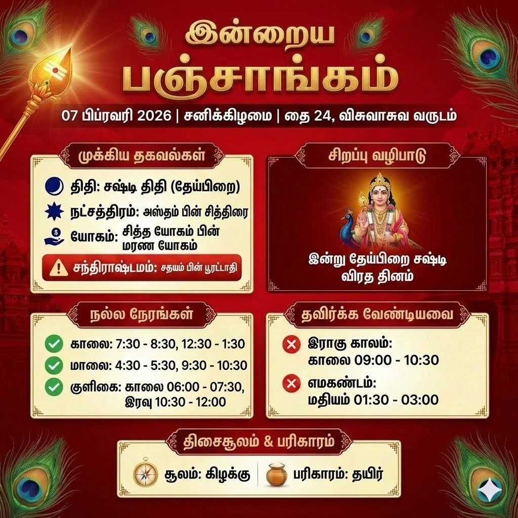 роЗройрпНро▒рпБ роЪро╖рпНроЯро┐ родро┐родро┐, роЪро┐родрпНродро┐ро░рпИ роироЯрпНроЪродрпНродро┐ро░роорпН. роЗройрпНро▒рпБ роЪродропроорпН рокро┐ройрпНрокрпБ рокрпВро░роЯрпНроЯро╛родро┐ роироЯрпНроЪродрпНродро┐ро░родрпНродро┐ро▒рпНроХрпБ роЪроирпНродро┐ро░ро╛ро╖рпНроЯроороорпН. роЗройрпНро▒рпБ рооро░рог ропрпЛроХроорпН. роЗройрпНро▒рпБ родрпЗропрпНрокро┐ро▒рпИ роЪро╖рпНроЯро┐ ро╡ро┐ро░род родро┐ройроорпН.