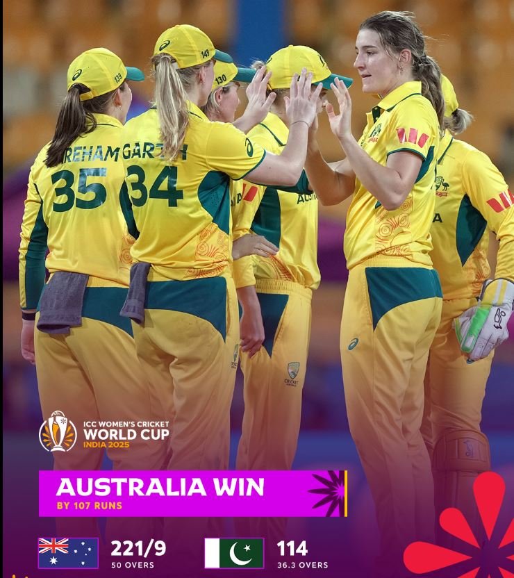 பின்னர், 222 என்ற வெற்றி இலக்குடன் களமிறங்கிய பாகிஸ்தான் அணி, அவுஸ்திரேலியாவின் பந்துவீச்சைச் சமாளிக்க முடியாமல், 36.3 ஓவர்களில் 114 ஓட்டங்களுக்குள் அனைத்து விக்கெட்டுகளையும் இழந்து படுதோல்வியடைந்தது. அவுஸ்திரேலியா சார்பில் கிம் கார்த் 3 விக்கெட்டுகளை வீழ்த்தினார்.
