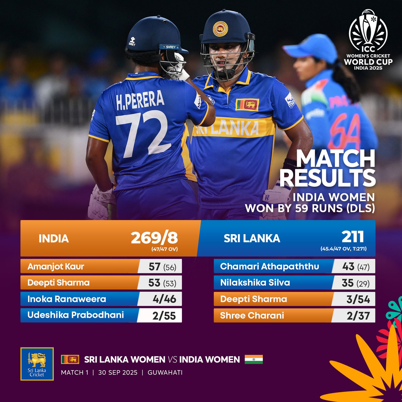 கௌகாத்தி: இந்தியாவும் இலங்கையும் இணைந்து நடத்தும் மகளிர் உலகக் கிண்ணத் தொடரின் முதல் போட்டியில், இலங்கை அணியை இந்திய அணி 59 ஓட்டங்கள் வித்தியாசத்தில் (DLS முறைப்படி) வீழ்த்தி, வெற்றியுடன் தொடரை ஆரம்பித்துள்ளது. துடுப்பாட்டம் மற்றும் பந்துவீச்சு ஆகிய இரண்டிலும் பிரகாசித்த தீப்தி ஷர்மா, இந்தியாவின் வெற்றிக்கு வித்திட்டார்.