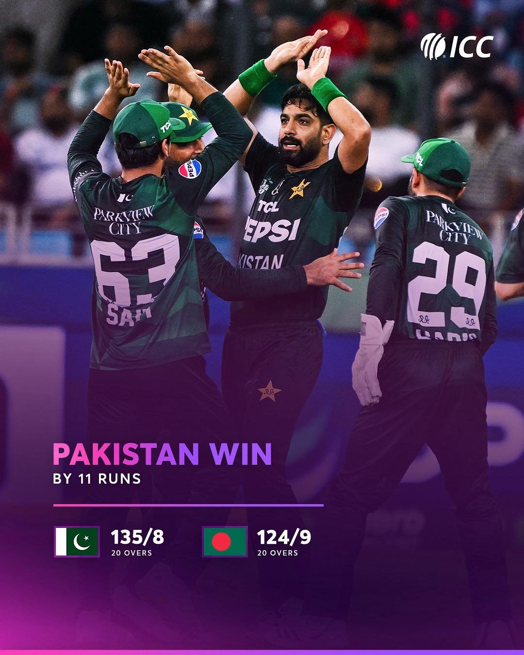 ஷாஹீன் ஷா அப்ரிடி (3/17) மற்றும் ஹரிஸ் ரவூப் (3/33) ஆகியோரின் அபாரமான பந்துவீச்சால், வங்கதேச அணியை 124 ஓட்டங்களுக்குள் பாகிஸ்தான் கட்டுப்படுத்தி, த்ரில் வெற்றியைப் பதிவு செய்தது.