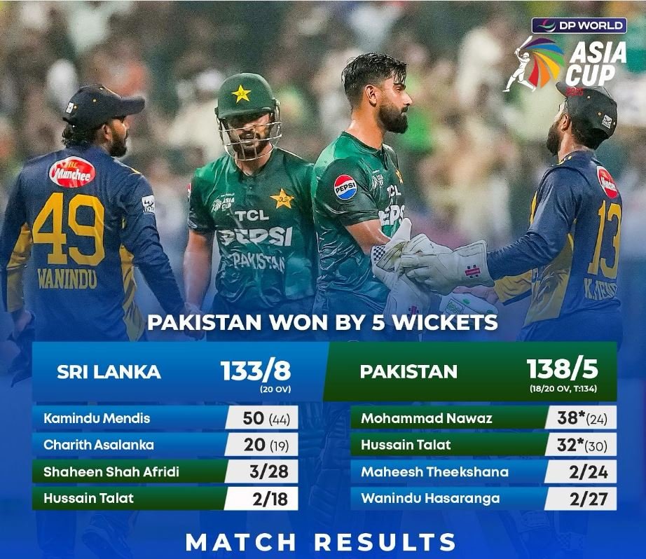 அபுதாபியில் நேற்று (23) நடைபெற்ற இப்போட்டியில், முதலில் துடுப்பெடுத்தாடிய இலங்கை அணி, பாகிஸ்தான் வேகப்பந்து வீச்சாளர் ஷாஹீன் ஷா அப்ரிடியின் (3/26) அபாரமான பந்துவீச்சால் ஆரம்பத்திலேயே தடுமாறியது. கமிந்து மெண்டிஸ் மாத்திரம் அரைசதம் (50) அடித்த போதிலும், இலங்கை அணியால் 20 ஓவர்களில் 8 விக்கெட் இழப்பிற்கு 133 ஓட்டங்களை மாத்திரமே பெற முடிந்தது.