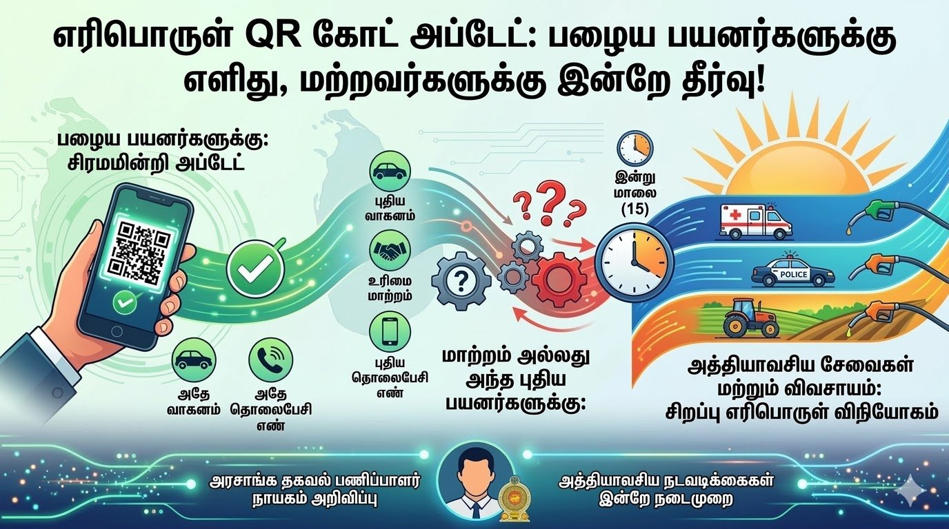 முன்பு எரிபொருள் கொள்வனவுக்காக QR கோட் பெற்றவர்கள், அதே வாகனம் மற்றும் தொலைபேசி எண்ணைப் பயன்படுத்தினால், எந்த சிரமமுமின்றித் தங்கள் கோட்களை அப்டேட் செய்ய முடியும் என அரசாங்க தகவல் பணிப்பாளர் நாயகம் அறிவித்துள்ளார்.