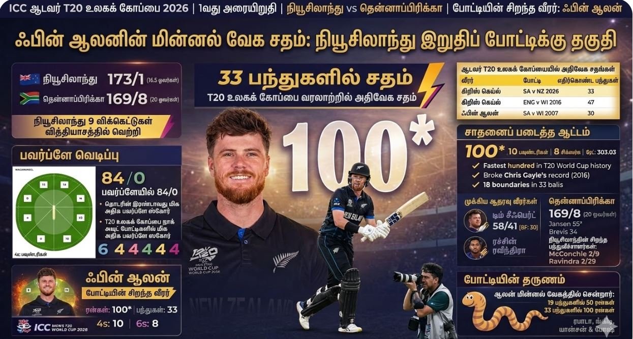 டி20 உலகக் கிண்ண வரலாற்றில் இதுவரை காணாத வகையில் நியூசிலாந்து ஆரம்பத் துடுப்பாட்ட வீரர் ஃபின் ஆலன் (Finn Allen) ஒரு அதிரடியான ஆட்டத்தை வெளிப்படுத்தியுள்ளார். வெறும் 19 பந்துகளில் அரைசதம் கடந்த அவர், அதனைத் தொடர்ந்து 33 பந்துகளில் சதம் விளாசி புதிய உலக சாதனை படைத்துள்ளார்.